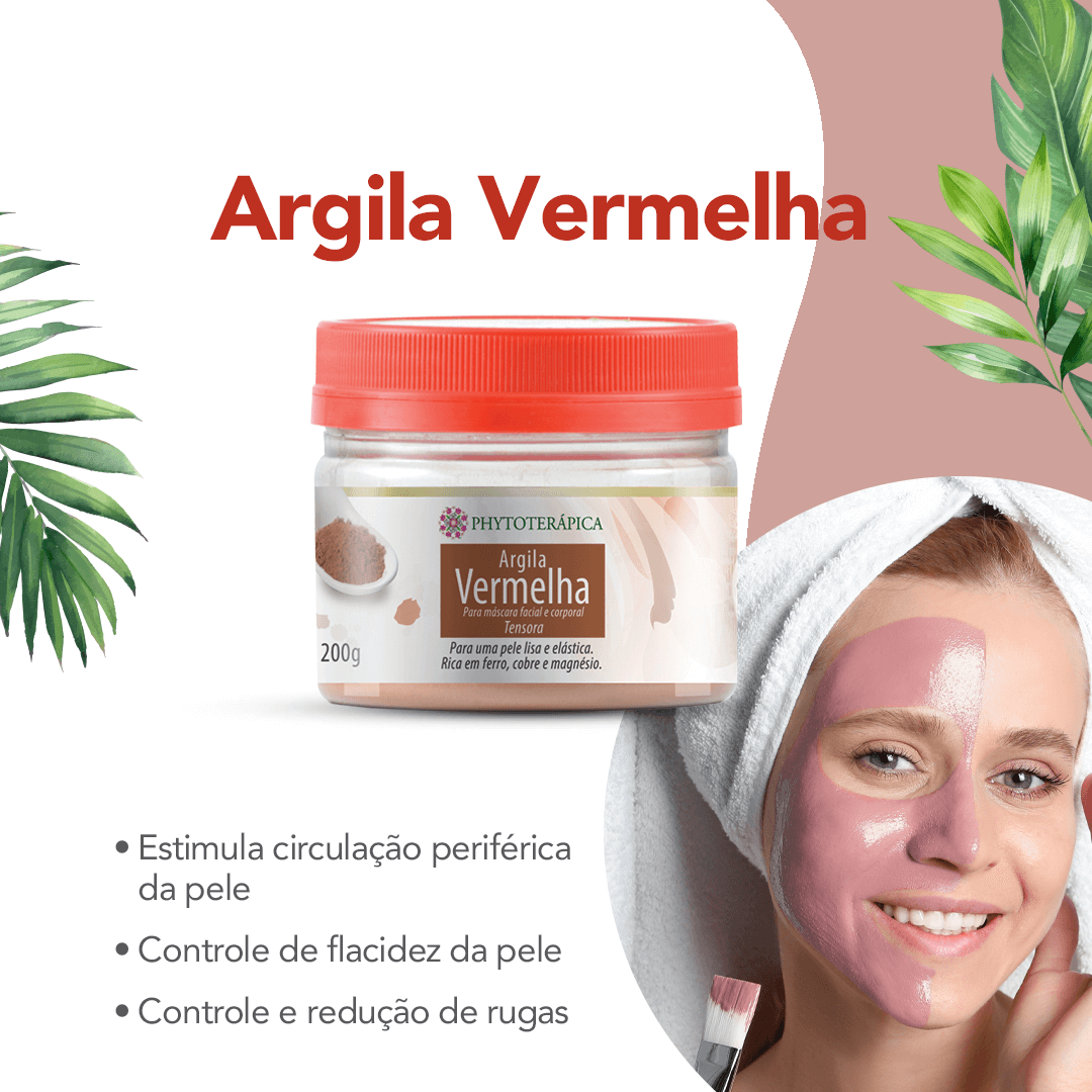 Apropriada para máscaras faciais e corporais, a Argila Vermelha Phytoterápica é estimulante da circulação e músculos enrijecidos. Com alto poder de absorção, retira da pele a sujeira e as toxinas. Oxigena e desintoxica as células, podendo ser usada na drenagem linfática. Suaviza as linhas de expressão e auxilia no tratamento de escamação da pele. É rica em ferro, cobre e magnésio, confere um efeito tensor por agir como um agente rejuvenescedor, ideal para obter uma pele lisa e elástica.