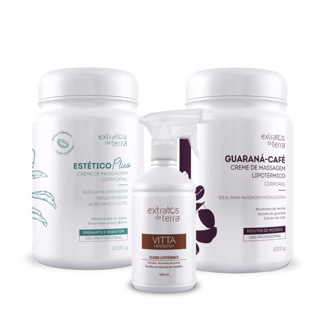 O Kit Profissional Redutor de Medidas e Celulite é ideal para clínicas e esteticistas que buscam montar protocolos corporais com alto desempenho. Combina três produtos com ações complementares para combater gordura localizada, celulite, edemas e melhorar o aspecto da pele: