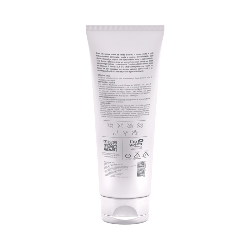 Com um toque floral, o Creme Hidratante Corporal tem o aroma das flores brancas, deixando a pele delicadamente perfumada, macia e sedosa. O creme desenvolvido com óleos e manteiga vegetal tem textura leve e absorve rapidamente, sem deixar a pele pegajosa, ao mesmo tempo que forma um filme que protege contra o ressecamento.